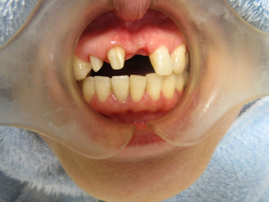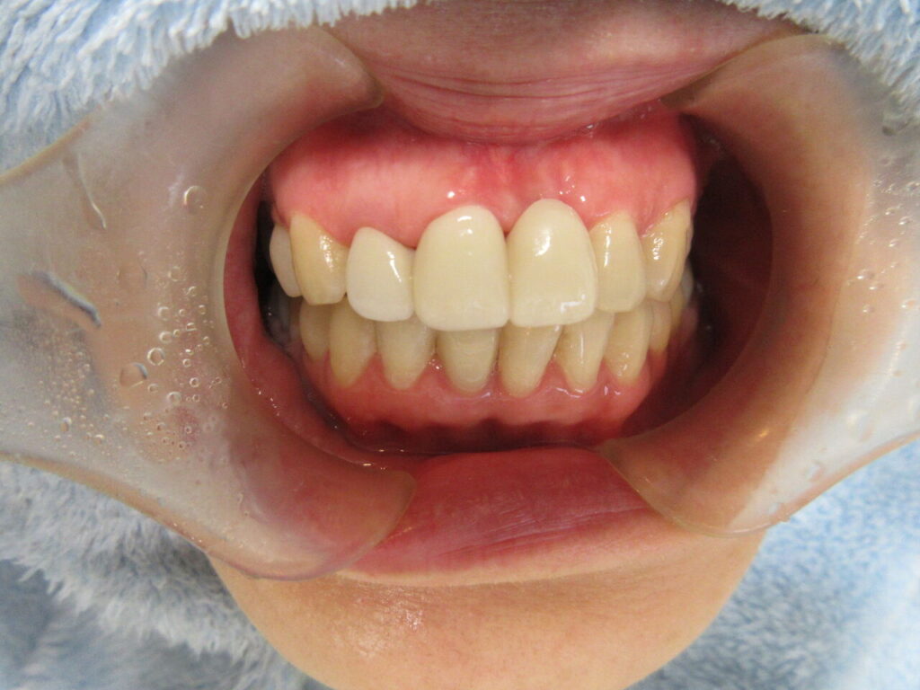 歯根破折により、左上1番を抜歯して左上2番の天然歯は削りたくなかったので元々削っていた被せ物を取って、延長ブリッジの方法で製作。