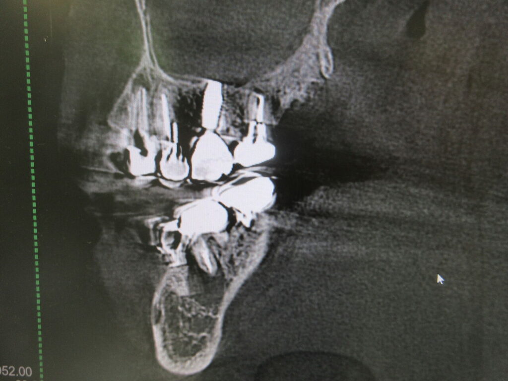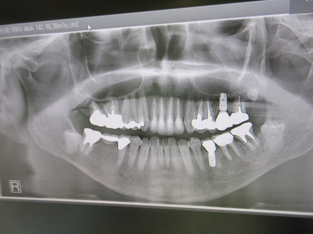 数年ぶりに来院された患者様でしたがパノラマレントゲンを撮ると下顎左側6番に骨透過像が見られます。CTで確認すると、かなり大きくおそらく手前のインプラントもだめにしてしまいます。