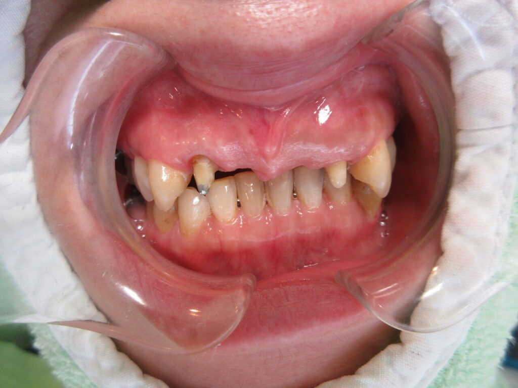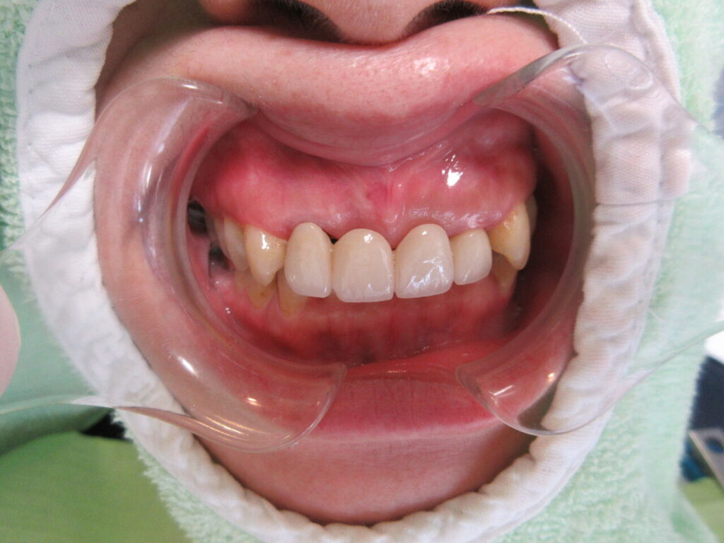1,1が保存不可能になり、抜歯してブリッジを製作、多少、抜歯部位が甘いため、修正。